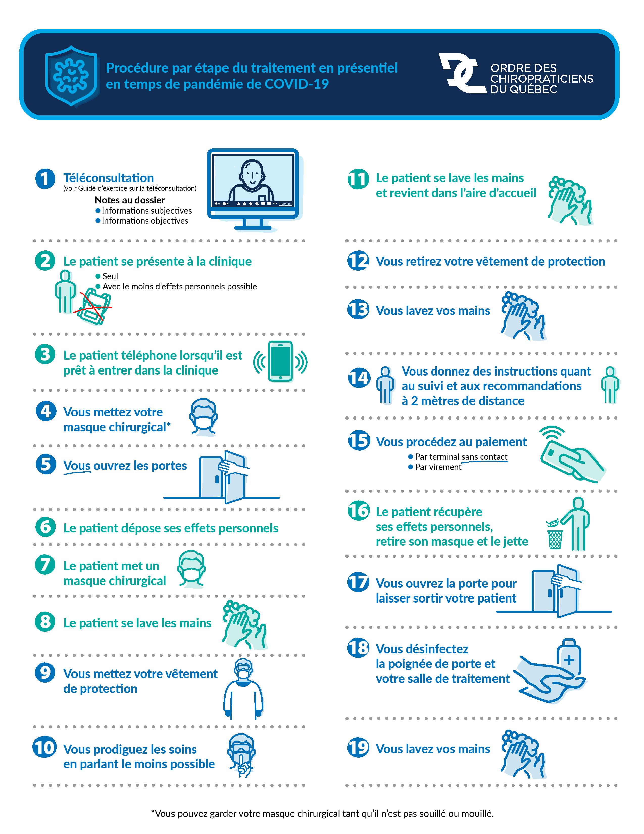 Dès la fin mars, nous avons mis en place un rigoureux protocole sanitaire décrit en détails dans le Guide synthèse de directives et recommandations pour la reprise complète de l’exercice de la chiropratique en contexte de pandémie (COVID-19). et résumé dans l’affiche ci-bas: