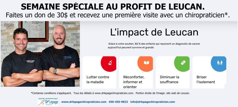 Notre prochaine semaine spéciale débute le 9 février 2026. Faites un don de 30 $ à Leucan et recevez une première visite avec un chiropraticien*.