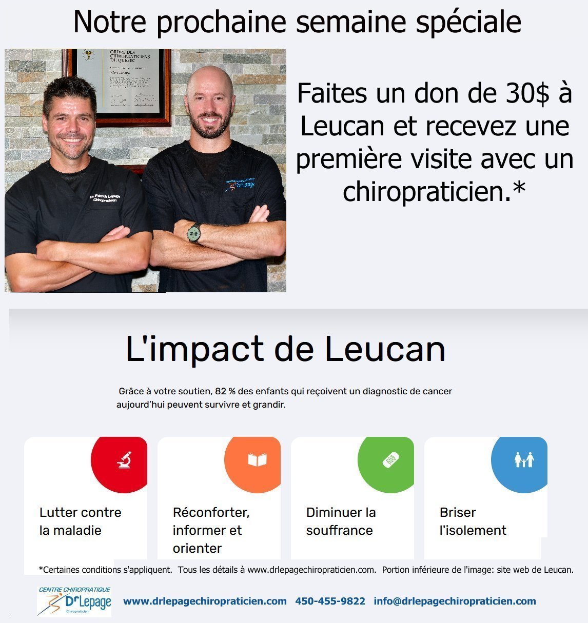 Our next special week begins on February 9th, 2026. Make a $30 donation to Leucan and receive a first visit with a chiropractor*.