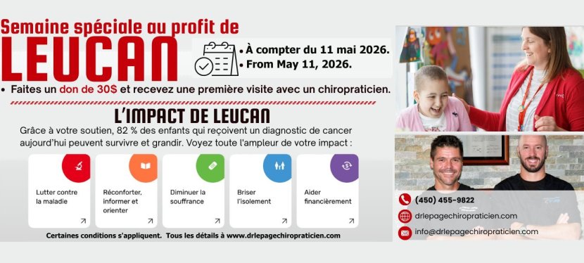 Notre prochaine semaine spéciale débute le 11 mai 2026. Faites un don de 30 $ à Leucan et recevez une première visite avec un chiropraticien*.